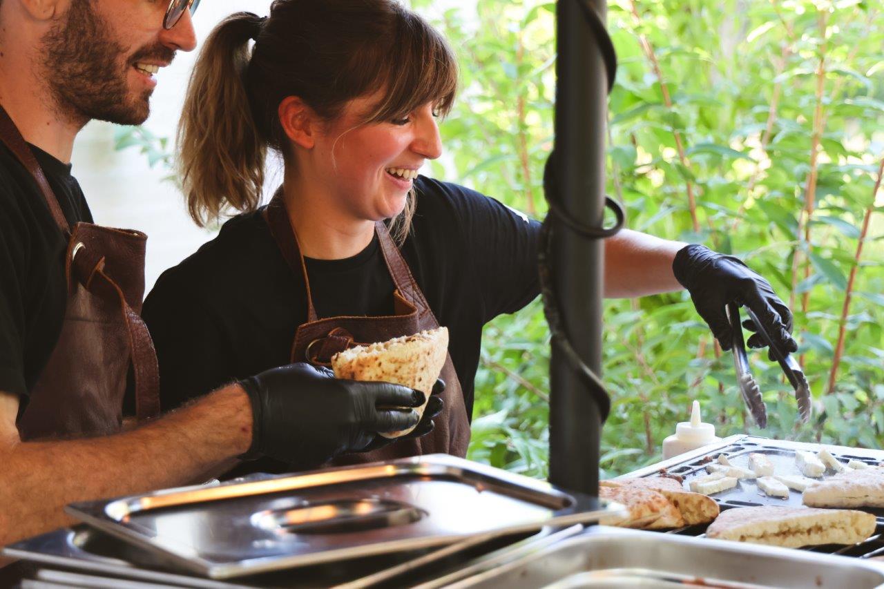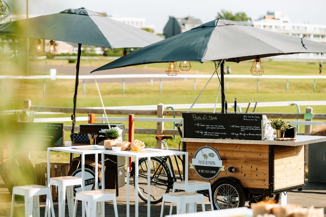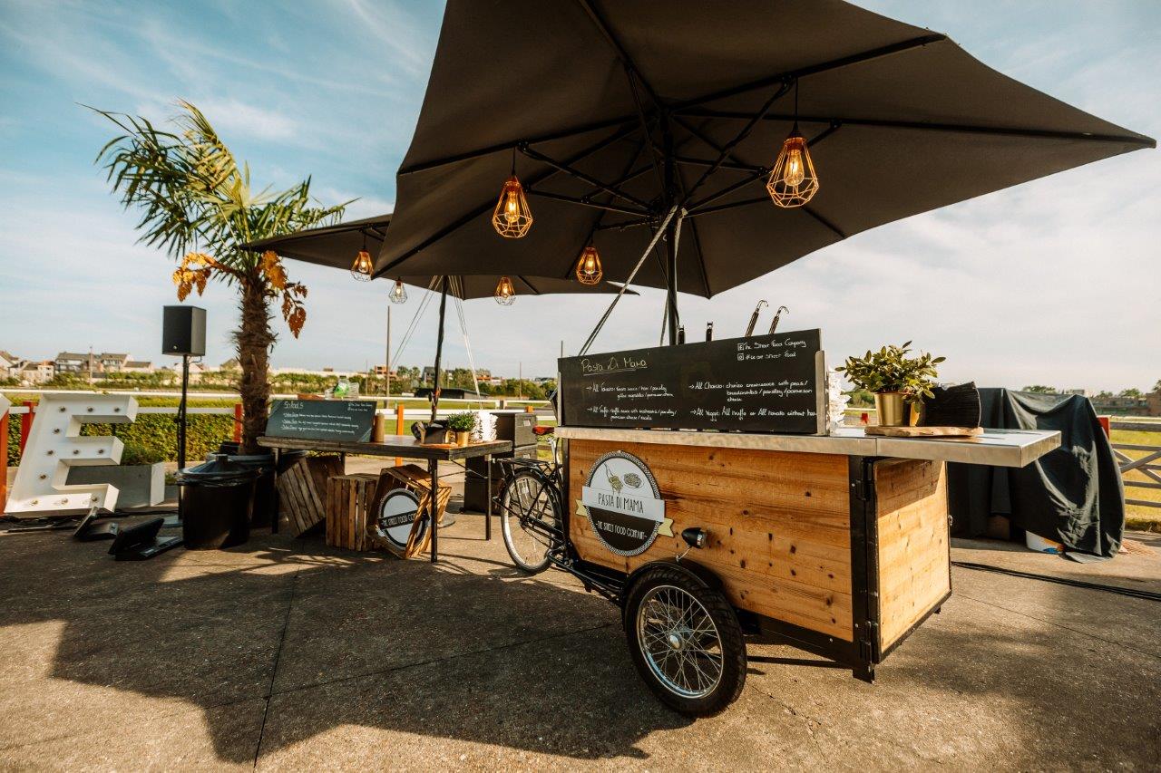 Avec son offre, The Street Food Company entend se démarquer du traiteur traditionnel. “Lui aussi travaille avec des produits de qualité, mais servis dans une assiette en porcelaine. Nous utilisons des emballages jetables écologiques, qui permettent de manger tout en marchant. Comme un traiteur classique, nous commençons par les amuse-gueules, qui circulent parmi l’assemblée. Ils sont un peu moins raffinés, mais n’ont rien à leur envier en termes de qualité et de saveur. Pour le plat principal, il y a plusieurs vélos, en fonction de l’ampleur de l’événement. Ils ont chacun leur propre concept. Par concept, il y a deux ou trois variantes plus une alternative végétarienne. Les mets sont préparés en direct sur le triporteur. Ce qui veut dire que nous cuisons la viande, les pâtes et assemblons les plats sur place – cela crée de l’animation. Et comme nous ajoutons les garnitures sur place, nous pouvons facilement tenir compte des allergènes ou des préférences des invités. Une fois le plat principal servi, les triporteurs sont entièrement débarrassés et transformés pour le dessert. Là encore, le client a le choix entre une quinzaines de propositions, à nouveau avec plusieurs variantes.”