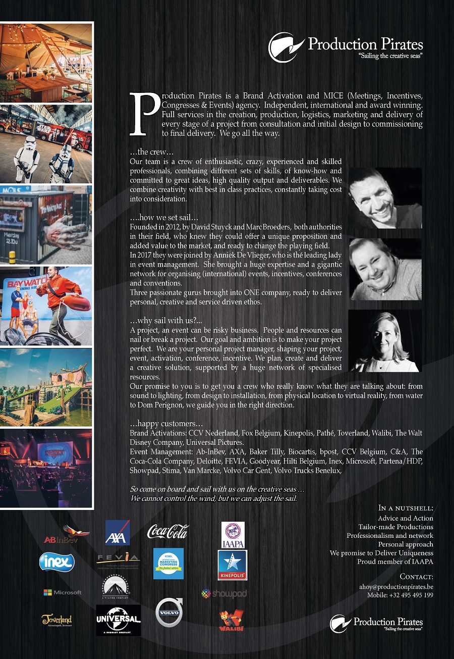 02 octobre 2017Plus dans trois têtes que dans une. Trois gourous rassemblés, ça donne une explosion d’idées créatives et de nombreuses possibilités ! Parfois délirantes, parfois sérieuses, toujours avec un résultat parfait. Production Pirates prend en charge vos brand activations, vos réunions et teambuilding, vos incentives et fêtes du personnel, vos événements de fin d’année et réceptions de nouvel an, vos congrès, vos galas, vos présentations de produit, etc.