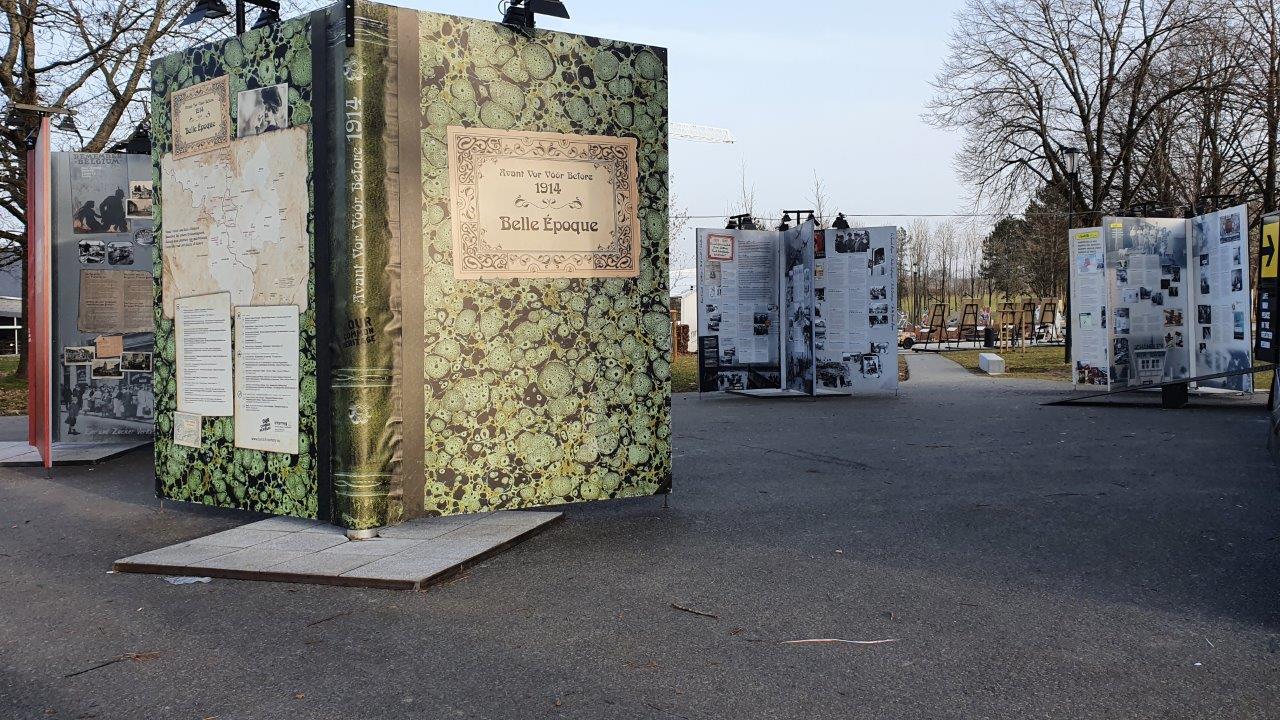 Cette exposition est divisée en deux parties. Un premier espace rapporte le vécu de nos populations sur 5 albums-photos géants relatifs aux 5 périodes suivantes : l’avant-première guerre mondiale, la première guerre mondiale, l’entre-deux guerres, la seconde guerre mondiale, et l’après-guerre avec la construction de l’Europe. Une deuxième partie plus « immersive » transmet par l’image et le son, une succession d’événements marquant cette histoire partagée.