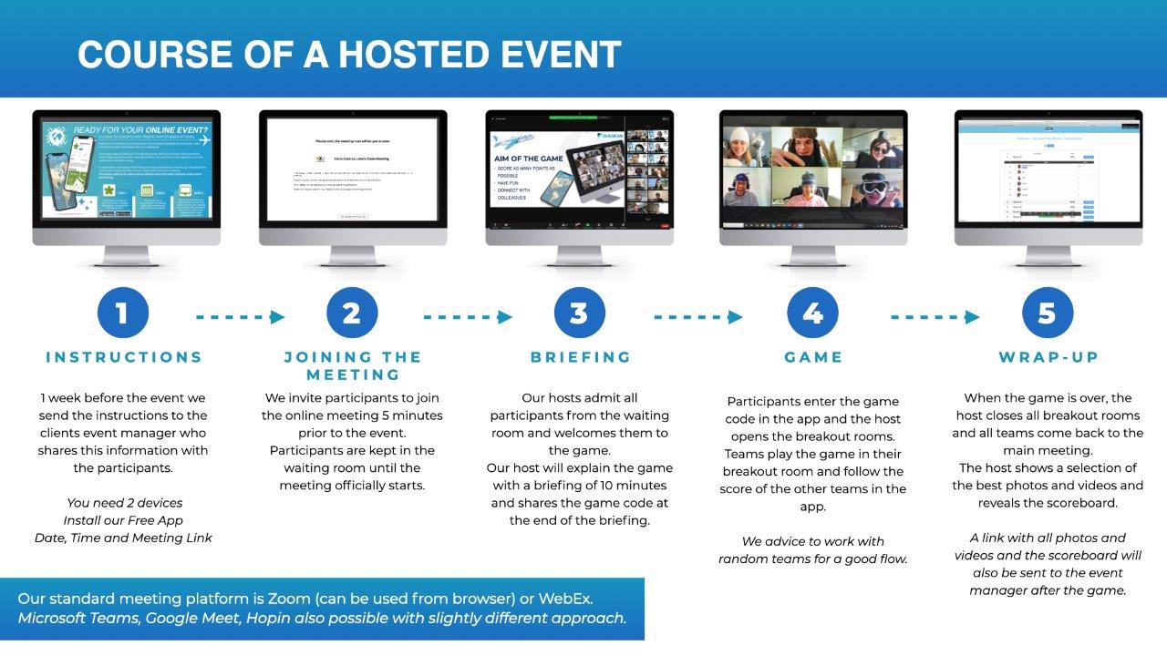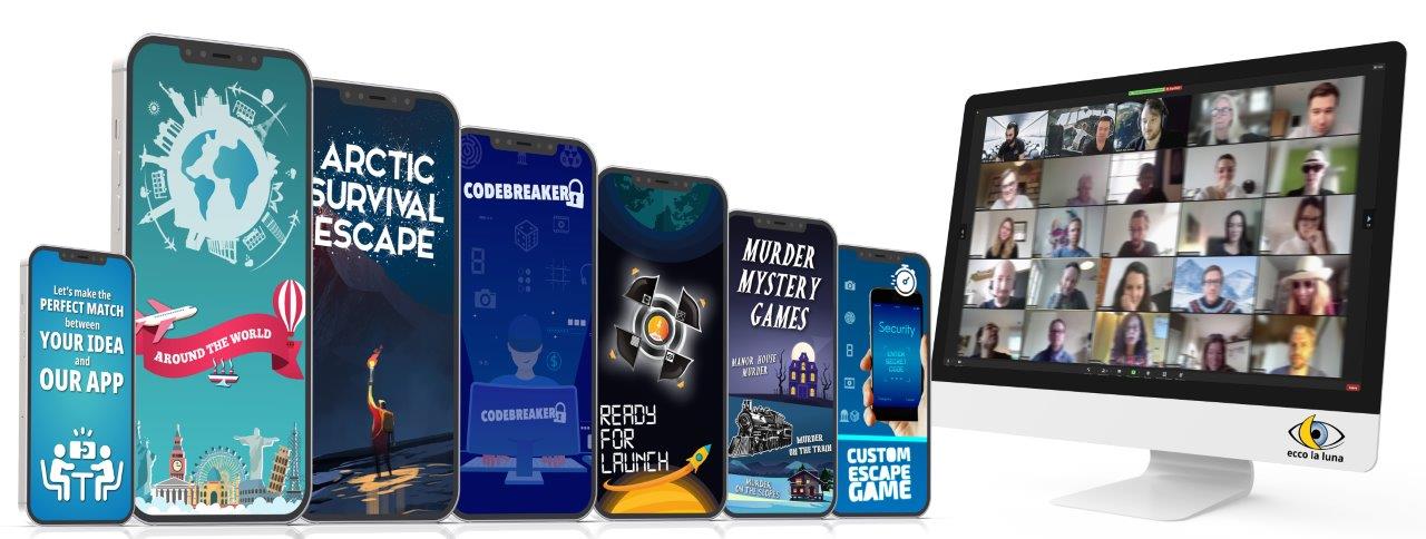 L’année dernière, Ecco La Luna a réalisé plus de 200 événements en ligne, pour plus de 13.500 participants. Les teambuildings en ligne d’Ecco La Luna sont accessibles via une plateforme de réunion en ligne. L’élément de jeu passe par une appli mobile spécifiquement développée (si vous n’avez pas la possibilité de l’installer, vous pouvez passer par un solution web-based). Dans ce cas, chaque participant doit prévoir deux appareils (par exemple un PC portable et un smartphone). L’équipe d’Ecco La Luna est toujours présente pour gérer le briefing, le jeu, la conclusion et l’assistance technique.