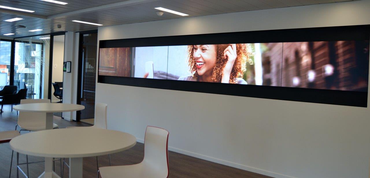 La members area de Piazza est équipée d’un super mur vidéo 5 x 1 Planar avec lecteur média Spinetix, complété d’enceintes 2-way In-Ceiling et d’un room controller qui gère la lumière et le son.