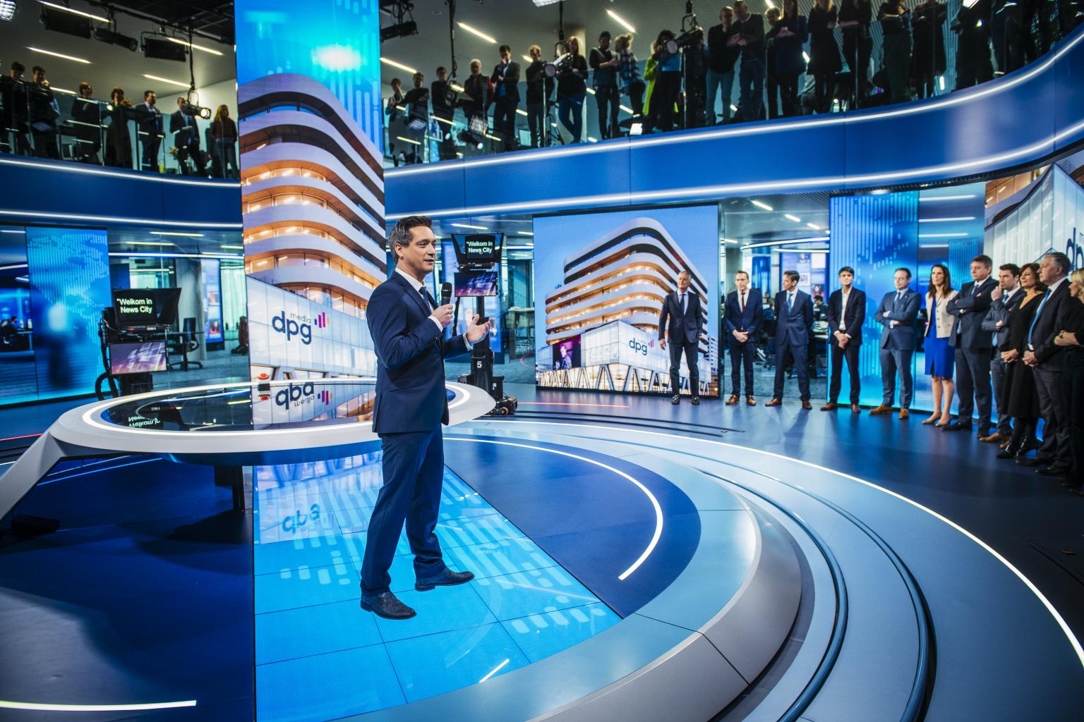 Dans le nouveau studio, il n'y a pas moins de huit murs vidéo LED Leyard de haute technologie, bons pour une surface d'écran de 70m². Le studio se trouve sur deux étages, entre lesquels une vidéo a été créée afin que le spectateur en arrière-plan découvre les monteurs des deux étages. L'élément qui attire l'attention est un grand mur vidéo vertical : un écran qui commence dans le sol et se termine dans le plafond au dernier étage du studio d'information.