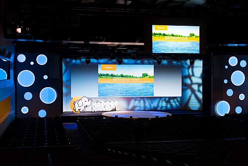 "Outre l'écran panoramique avec rétroprojection classique en fond de scène, la particularité de notre intervention résidait dans le mapping de décors évolutifs et changeants faisant la part belle à des boules et cercles – un clin d'œil au logo d'Hadoop – sur deux grands décors construits de chaque côté de l'écran panoramique. Pour l'ensemble de ces prestations, nous avons déployé 4 projecteurs Christie Digital HD20 K et un projecteur Christie Digital HD10 K, un système de gestion Spyder X20 ainsi qu'un Media Server Modulo Pi pour la gestion du mapping.