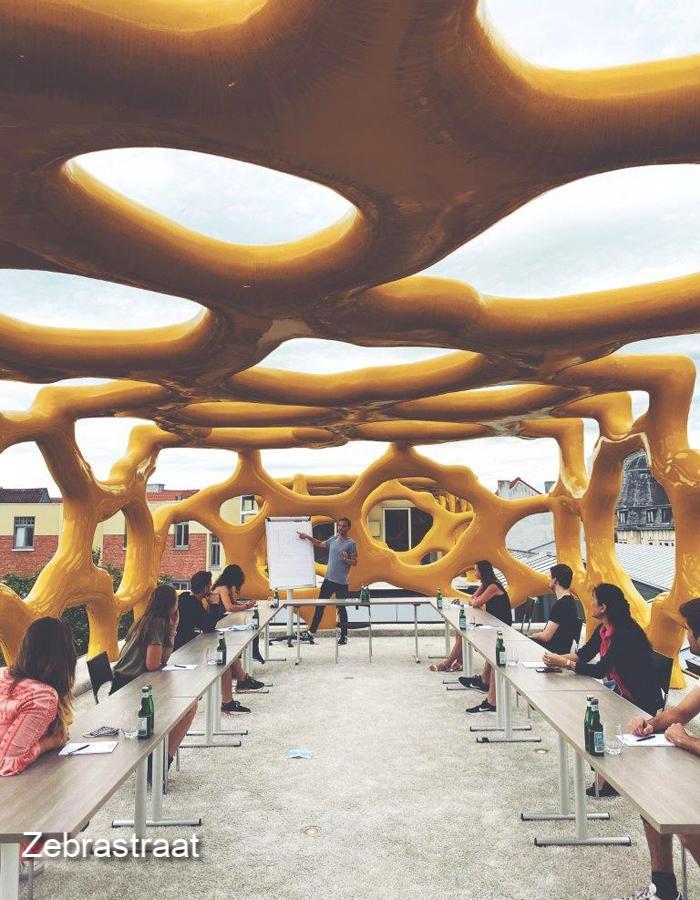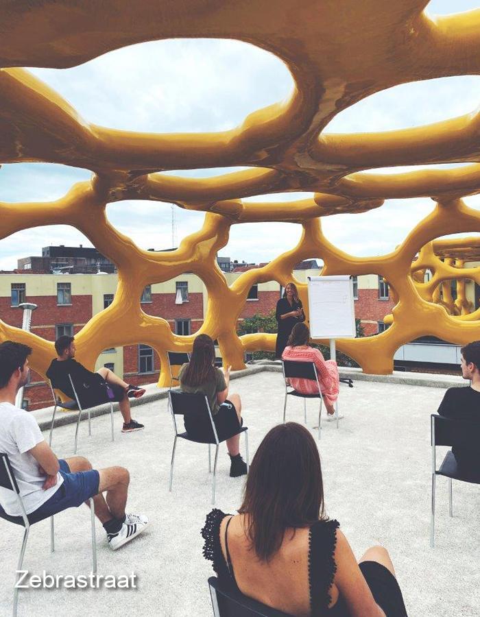 Le Zebrastraat présente trois formules de réunion en extérieur hors du commun et coronaproof. Vous avez la possibilité de faire votre réunion sur le toit de Gand, sous l'œuvre d'art Warsubec de Nick Ervinck. La salle Piranha, située dans l'atrium de New Zebra sous l'œuvre ‘Cirbuats’ de Nick Ervinck couvrant toute la façade, est une structure vitrée au caractère très ouvert, munie de tous les équipements de réunion nécessaires. Et sur la place centrale, vous pouvez faire votre réunion avec vue sur l’étang et la terrasse.