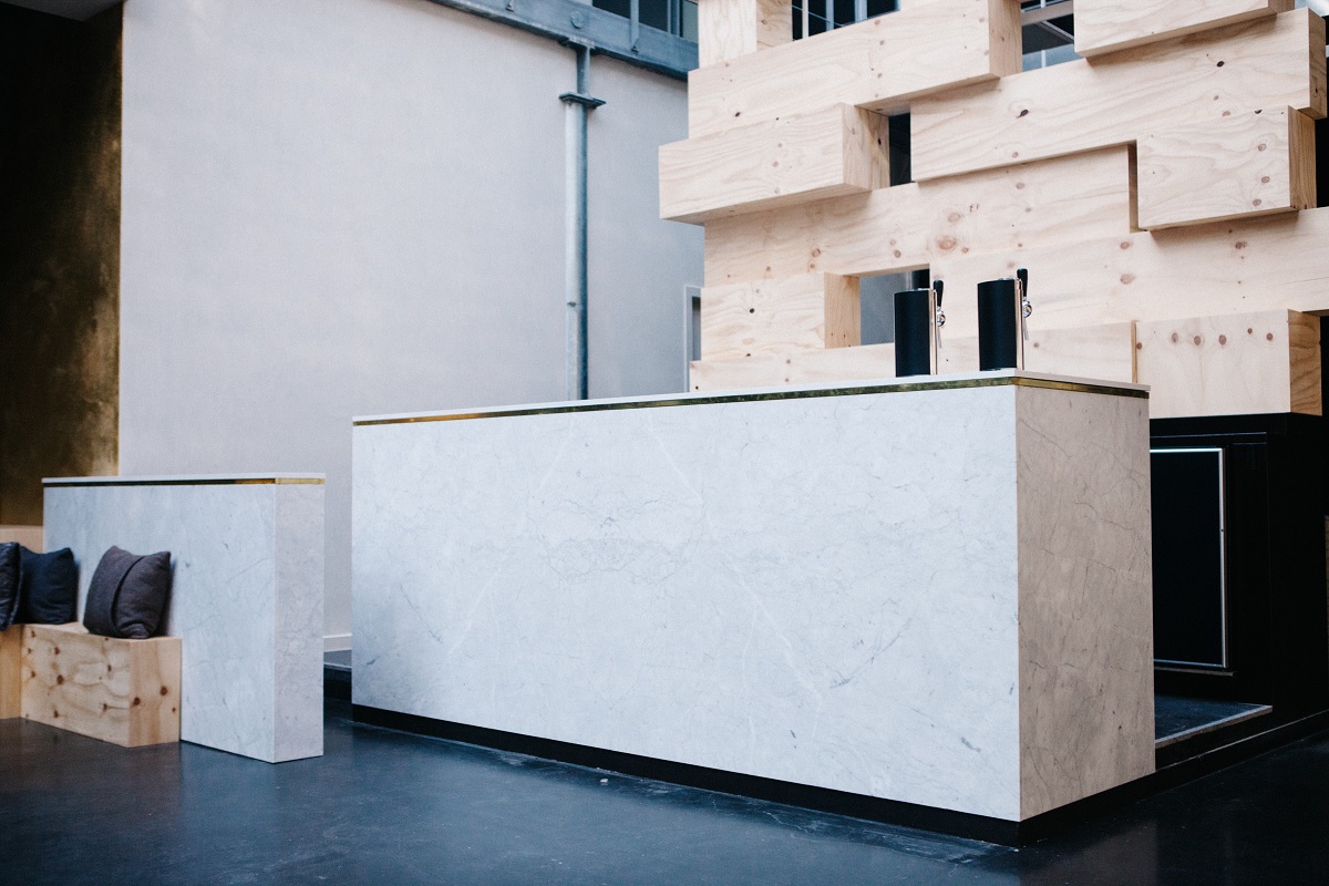 Avant même l’entrée, le visiteur est agréablement surpris par la terrasse extérieure provisoire qui prolonge les lieux en été.