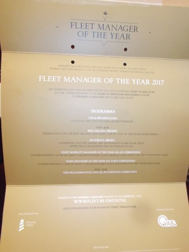 19 janvier 2017Le mardi 10 janvier, Effective Media organisait la 22ème édition du FLEET Manager of the Year. Le trophée du ‘Fleet Manager of the Year’ récompense l’homme ou la femme considéré(e) comme le Fleet Manager le plus méritant de l’année par les lecteurs du magazine FLEET ainsi que 800 acteurs de premier plan du secteur fleet belge. L’événement se déroulait à Brussels Kart Expo.