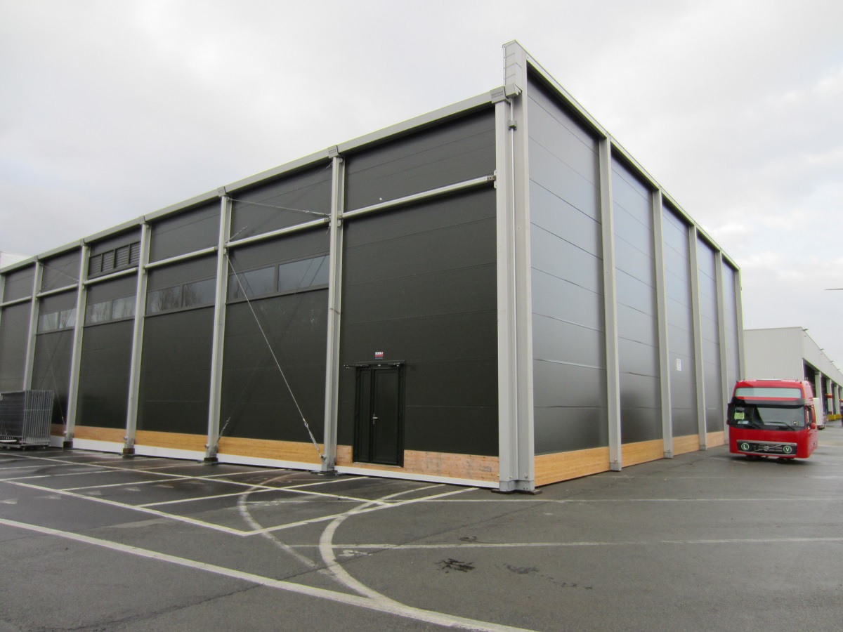 Afin de faciliter le chevauchement de production de deux modèles de camions, Volvo, souhaitait installer une infrastructure de production temporaire pour une période de 6 mois. C’est ainsi qu’un atelier complet de 750 m² a été construit en moins de de deux semaines à Gand. Détail intéressant : Grace au sol massif capable de supporter une charge de 2,5 tonnes, la production des deux modèles s’est poursuivi sans problème