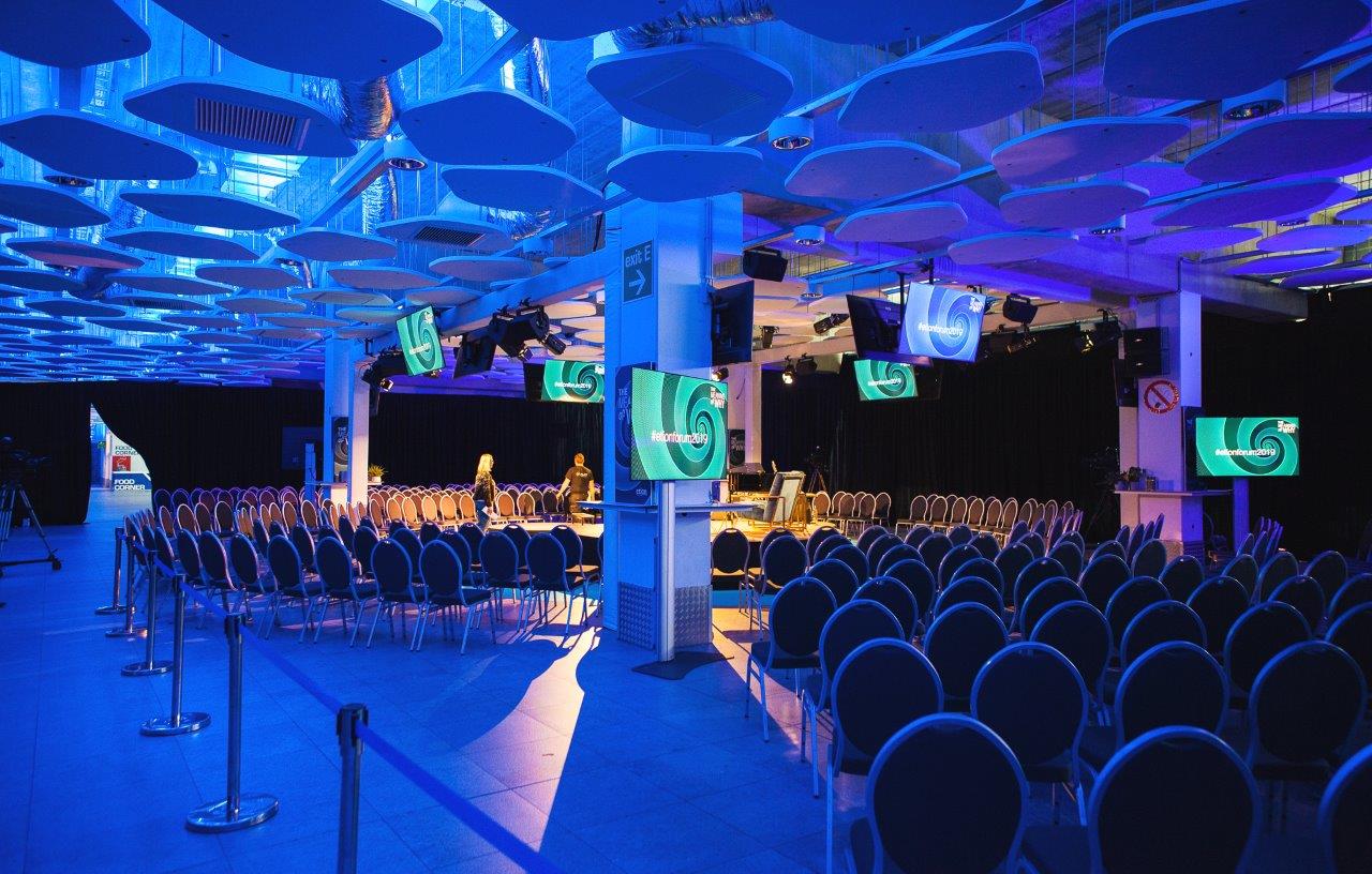 Eventbureau Sylvester opteerde ook dit jaar voor een 360-graden-opstelling om de betrokkenheid en interactie tussen de sprekers en het publiek nog te vergroten. In opdracht van Eventbureau Sylvester voorzag Play AV de volledige zaalinrichting van A tot Z, alsook de audiovisuele ondersteuning in klank & beeld.
