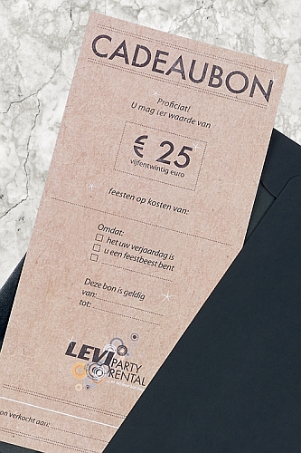 Tenslotte lanceert Levi Party Rental nog een knap initiatief voor wie op zoek is naar het perfecte geschenk: "Geef eens een feest cadeau! Voor wie eens iets anders als presentje wil geven, zijn er nu ook cadeaubonnen ter waarde van 25 euro elk. De bonnen zijn voorlopig enkel te koop aan het onthaal, maar zullen binnenkort ook verkrijgbaar zijn via de website.