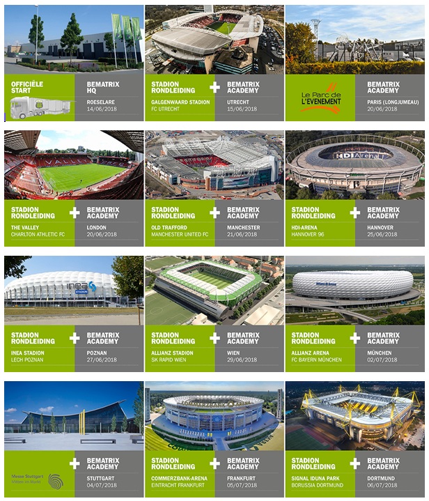 Een ideale link, dacht men bij beMatrix & het thema van de roadshow was gevonden. Men houdt immers halt bij verschillende voetbalstadium in Europa, waaronder bijvoorbeeld de Allianz Arena in München (Bayern München), Old Trafford in Manchester (Manchester United), Signal Iduna Park (Borussia Dortmund), Galgenwaard stadion in Utrecht (FC Utrecht),…