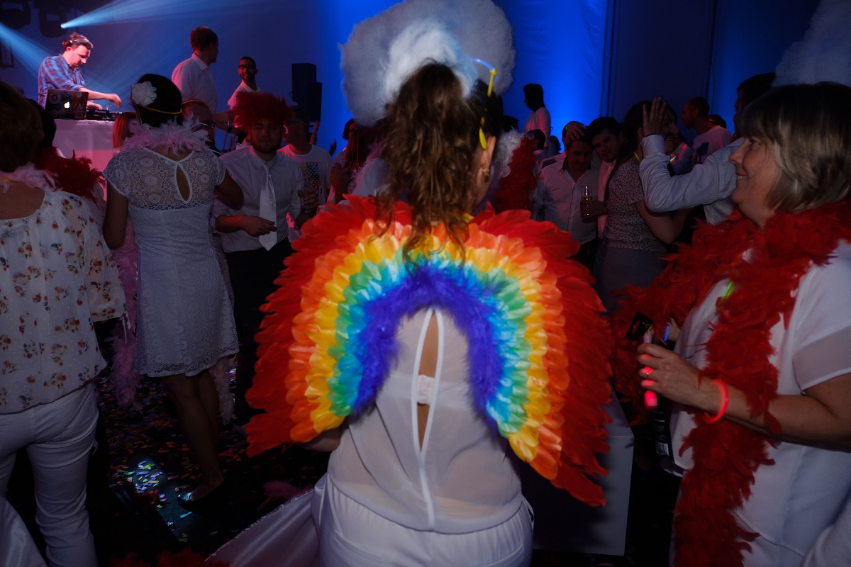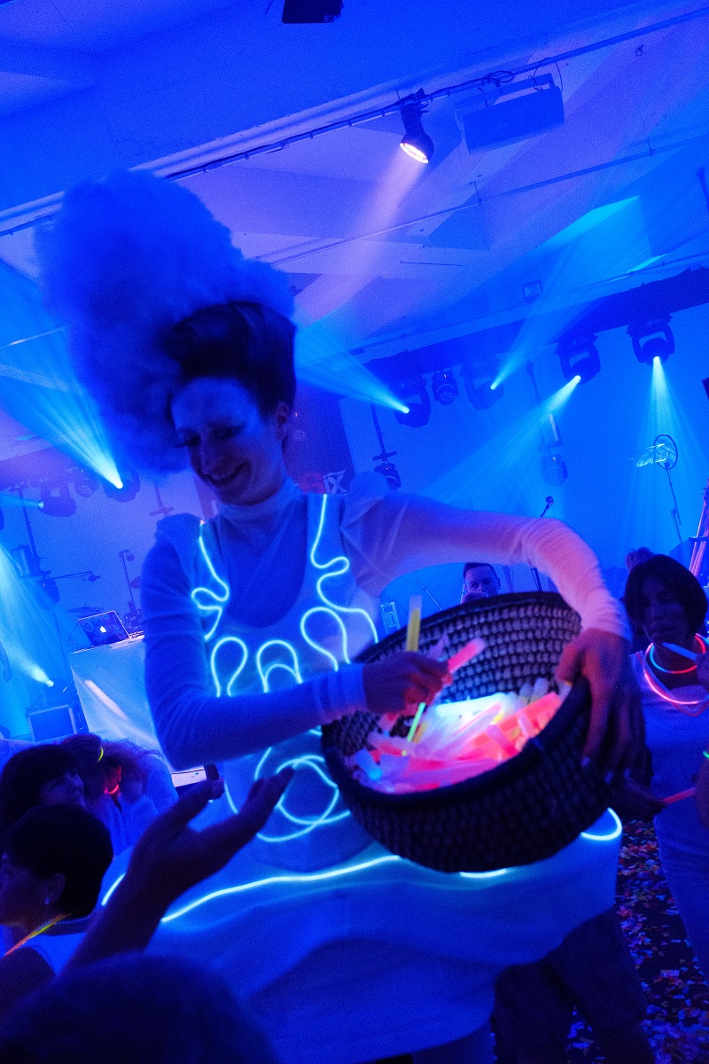 Kleurrijke figuren deelden al dansend speelse gadgets uit, die de uitgelaten sfeer compleet maakten. De DJ nam over, en draaide de juiste muziek, gezien de vele dansende lichamen.
