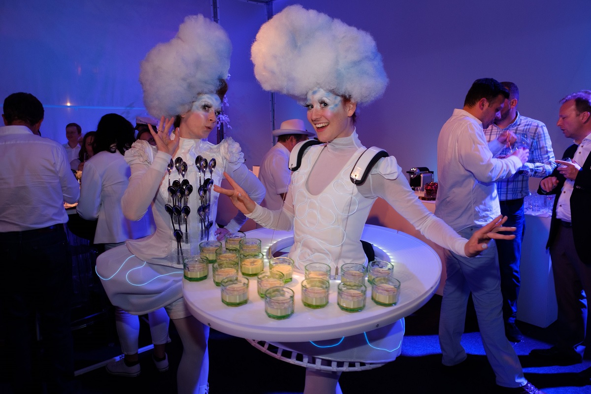 Na het diner veranderde de sfeer plotsklaps in een uitgelaten kleurrijke partymood. Een verrassingsact in het donker bracht de nodige kleurrijke energie, en geen seconde later barstte van de overkant van de zaal een live-optreden los, die het aanwezige publiek onmiddellijk mee nam in keiharde ambiance.