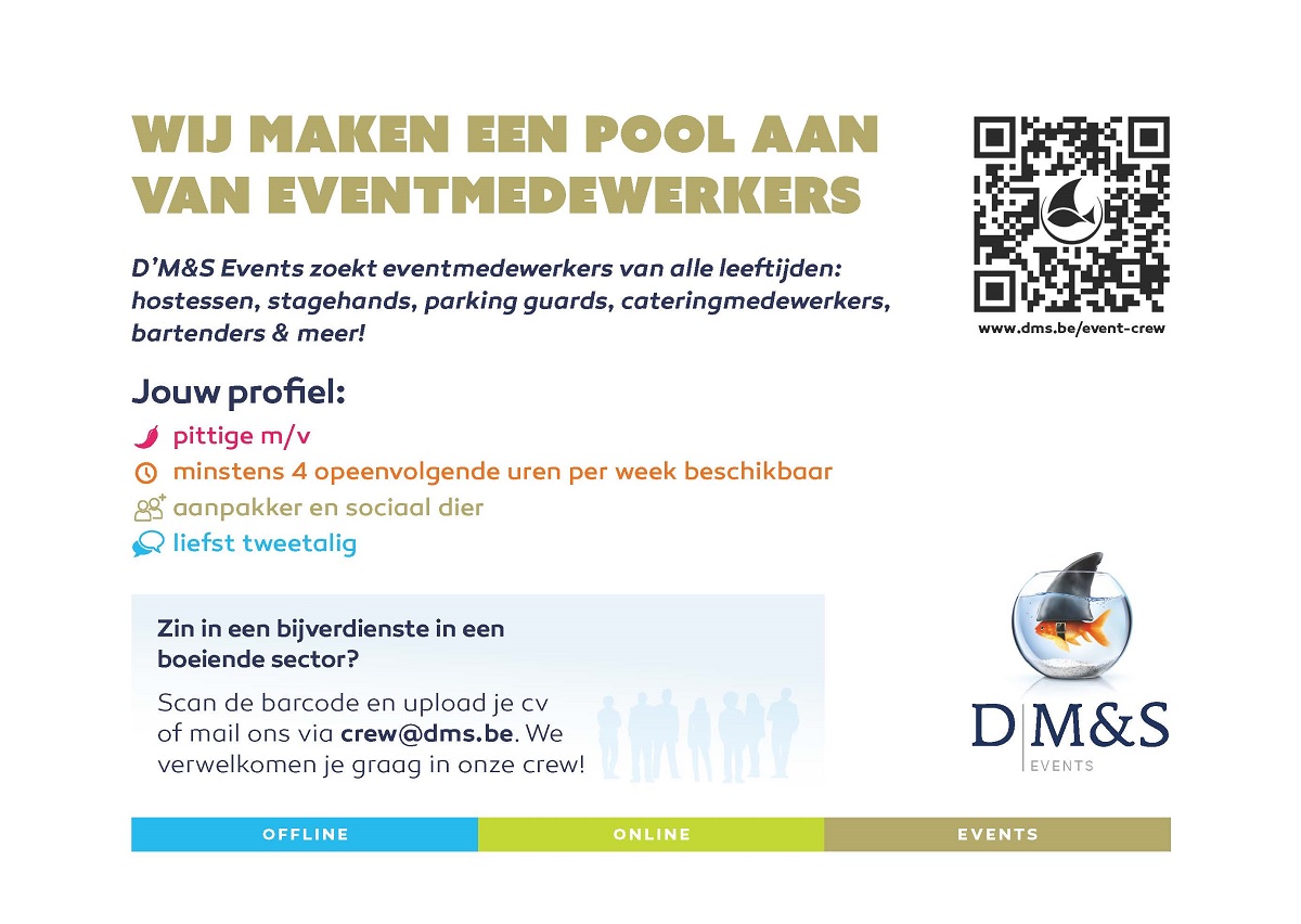 23 maart 2018Interesse om het eventteam van DM&S te ondersteunen? We zijn continu op zoek naar enthousiaste hostessen, stagehands, parking guards, cateringmedewerkers of bartenders. Registreer u via onze website en maak binnenkort deel uit van onze EVENTPOOL.