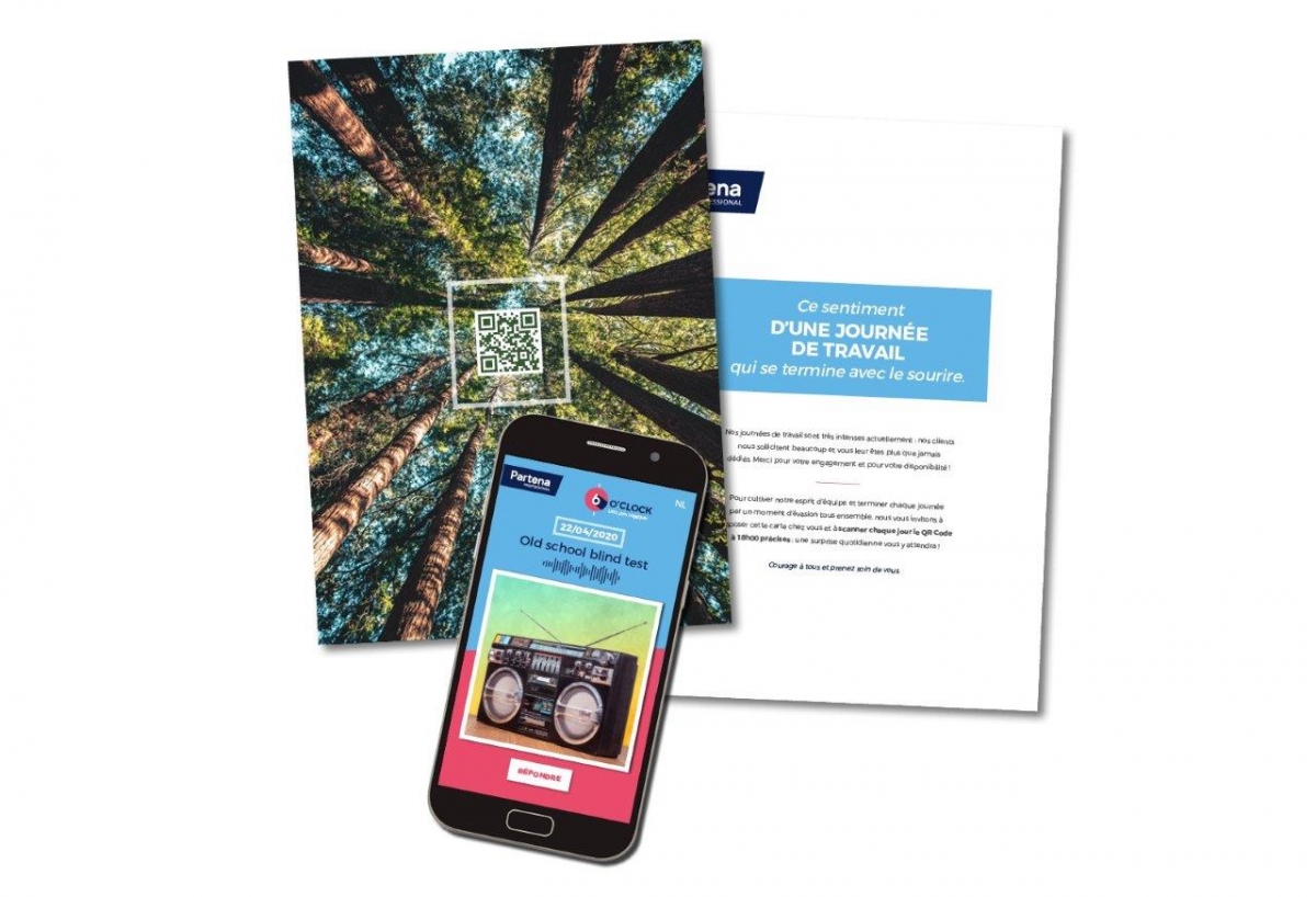 In samenwerking met de afdeling interne communicatie organiseert het bureau een dagelijkse afspraak met de naam '6 O’clock' en dit uiteraard om ... 18:00 uur. Op dit exacte tijdstip kunnen de Partena Professional-medewerkers elke dag genieten van nieuwe leuke content (video's, tutorials, recepten, games, enz.). Deze is toegankelijk via een eenvoudige QR-code. Een originele manier, ook al is iedereen van elkaar gescheiden, om de werkdag samen af te sluiten.