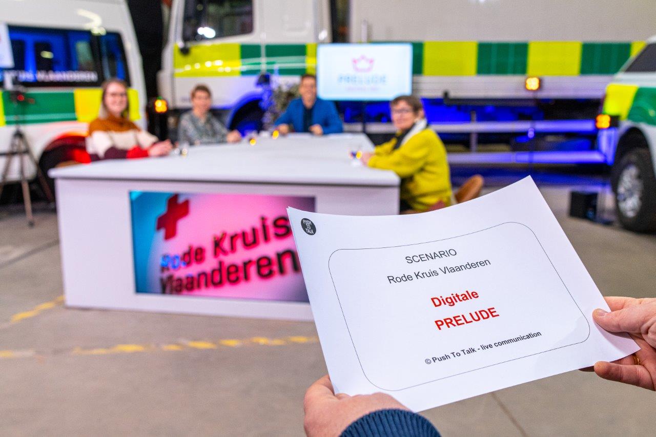 Prelude 2021 was voor de allereerste keer van A tot Z een digitaal event. Het event werd gelivestreamd en met een op voorhand ontvangen bakje popcorn op de schoot volgden bijna 400 vrijwilligers de uitzending. Push To Talk ging op zoek naar een geschikte locatie en vond die in de loods van de Logistieke Eenheid, dat ook het kloppend hart is van Rode Kruis-Vlaanderen. Een locatie die het Rode Kruis ademt, dus. De vele topics die overgebracht moesten werden zorgvuldig gescript en dat leidde tot een inspirerende én interactieve editie van de jaarlijkse Prelude. “Dat we in interactie konden gaan met onze vrijwilligers was een grote meerwaarde en hét grote voordeel van dit event digitaal te organiseren,” vertelt Marjolein Van daele, verantwoordelijke Interne Communicatie van Rode Kruis-Vlaanderen. “De kijkers konden zich volop uitleven in de live chat en vragen stellen over de onderwerpen die passeerden, maar ook hun mening geven over het gekozen stickerfiguur. En die kans lieten ze niet onbenut”.