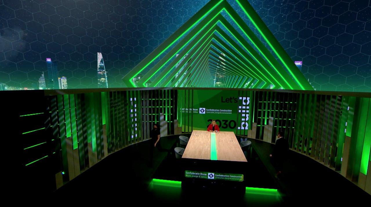 Vanuit de studio’s van het Corda Theater in Hasselt sprak moderator Indra Dewitte onder andere met premier Alexander De Croo, professor Stijn Baert & Taha Riani over de grootste uitdagingen binnen de bouwsector. De rode draad doorheen alle gesprekken was het thema ‘Let’s build 2030’. In het komende decennium wil de sector vooral inzetten op het aantrekken van jongeren, het verwezenlijken van duurzaamheidsdoelstellingen en het integreren van de toenemende digitalisering en industrialisering.