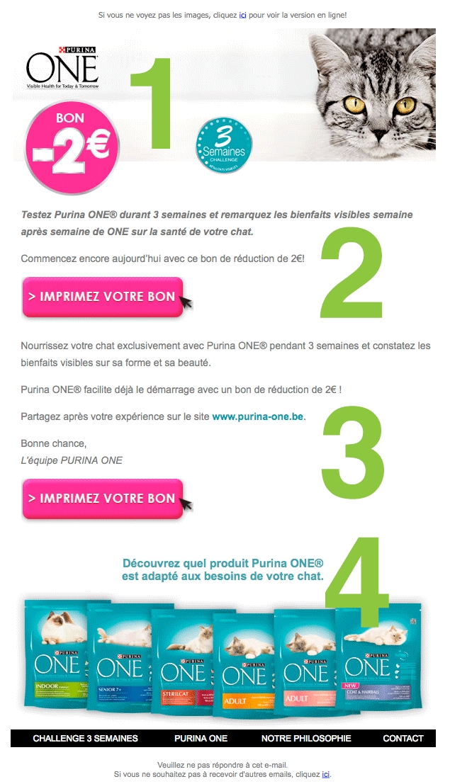 4 Eens je de kortingsbon hebt afgedrukt, moet je uiteraard ook het product nog gaan kopen in de winkel. Dus moet je het gamma van Purina ook herkennen. Dus wordt er afgesloten met een productfoto. Netjes naast elkaar, alsof ze in het winkelrek staan. Het is overigens ook een perfecte overgang naar de footer. Die ook weer expliciet verwijst naar de uitdaging om drie weken het juiste kattenvoedsel geven. Wie nu geen gezonde kat heeft…
