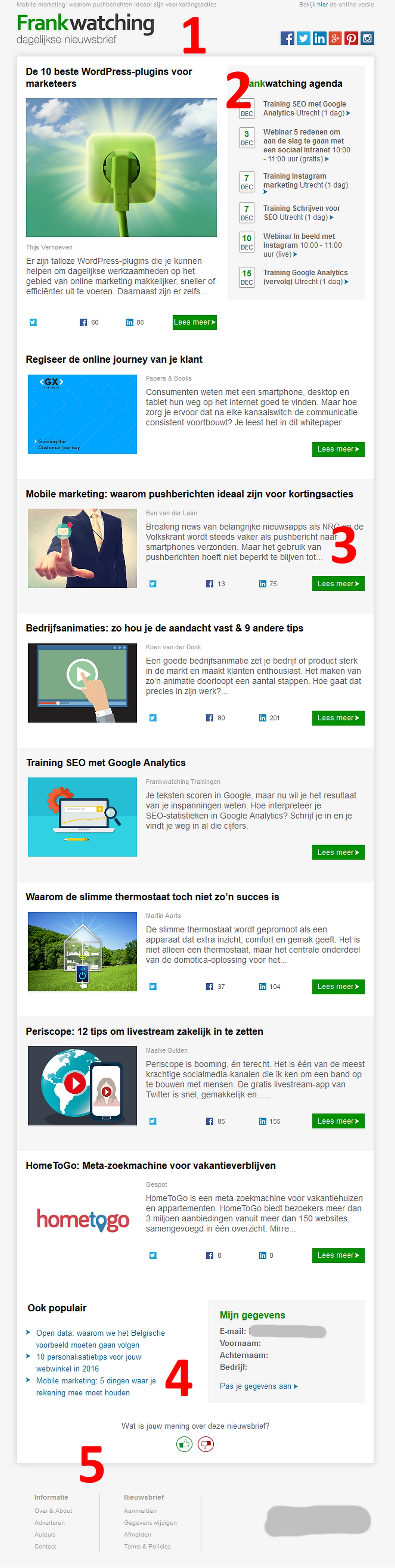 30 november 2015Het voorbeeld dat Flexmail vandaag opvoert van Frankwatching, is een duidelijk voorbeeld hoe content ingezet wordt om uiteindelijk omzet te draaien. Maar er zijn nog meer opmerkelijke elementen aan dit e-mailbericht.