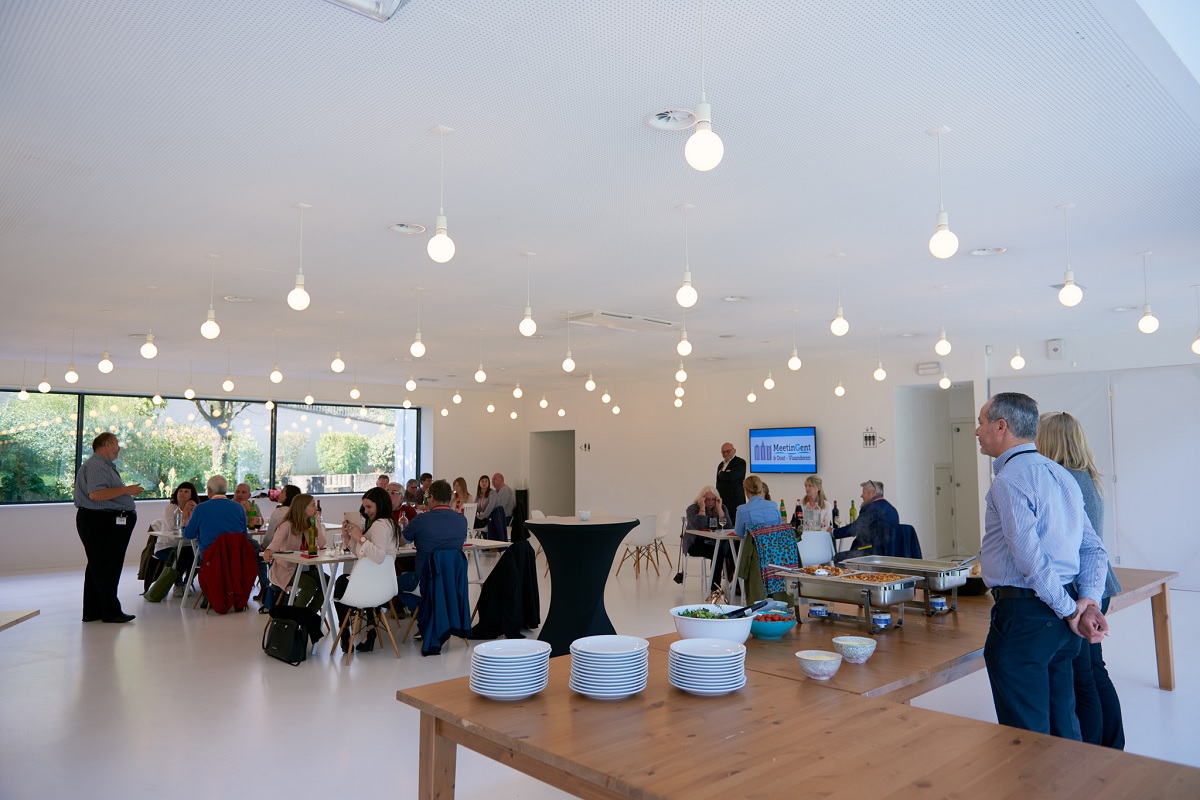 Na een uitgebreide rondleiding bracht een bus van Coach partners ons naar de volgende locatie: Aula Schaubroeck in Nazareth, een locatie tussen Gent en Oudenaarde. Het seminariecentrum biedt 4 polyvalente zalen geschikt voor opleidingen. Daarnaast beschikt de venue over een aula die plaats biedt aan 220 personen. Liever een receptie? In de foyer is er plaats genoeg voor 330 personen om iedereen te voorzien van de beste service. Ook wij konden genieten van een warme kop koffie met heerlijke koekjes.