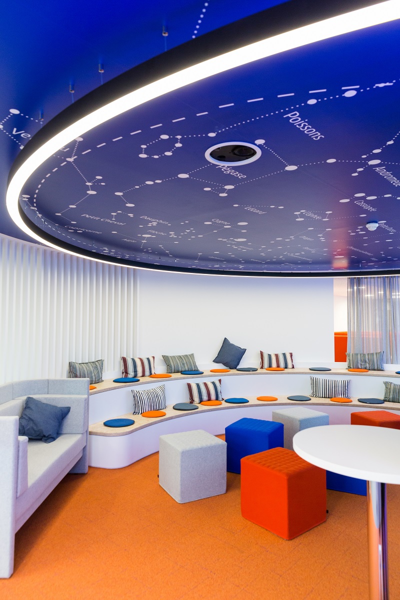 - 150 m² is gewijd aan leren en opleiden onder de naam "klaslokaal van de toekomst". Dit concept, ontwikkeld door RICOH, biedt een nieuwe lesmethode op basis van nieuwe technologieën. Naast de iPad Pro beschikt de klas over een 84-inch interactief whiteboard, drie 55-inch interactieve tafels en akoestisch loungemeubilair, ontwikkeld door ABV in samenwerking met ontwerper Alain Berteau. Bovendien zijn de ruimtes flexibel, waardoor werkgroepen gemaakt kunnen worden en meer interactiviteit kan ontstaan.