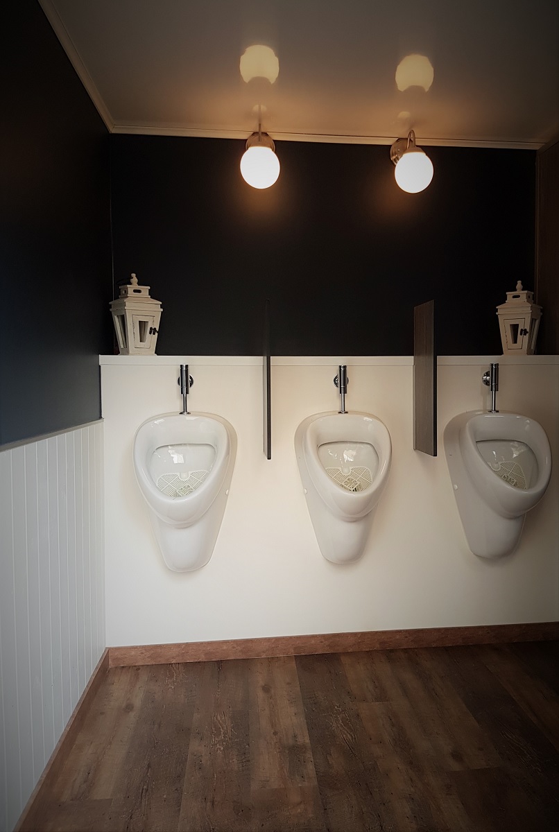 De damestoiletten zijn voorzien van drie WC-hokjes en twee wastafels. De herentoiletten hebben één WC-hokje, drie urinoirs en een wastafel.