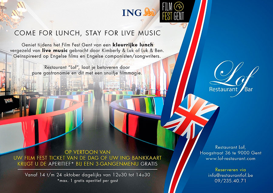 Tijdens de gehele periode van Film Fest Gent editie 2015, vanaf 14 oktober t/m 24 oktober 2015, kan u genieten van een kleurrijke lunch vergezeld van live muziek.