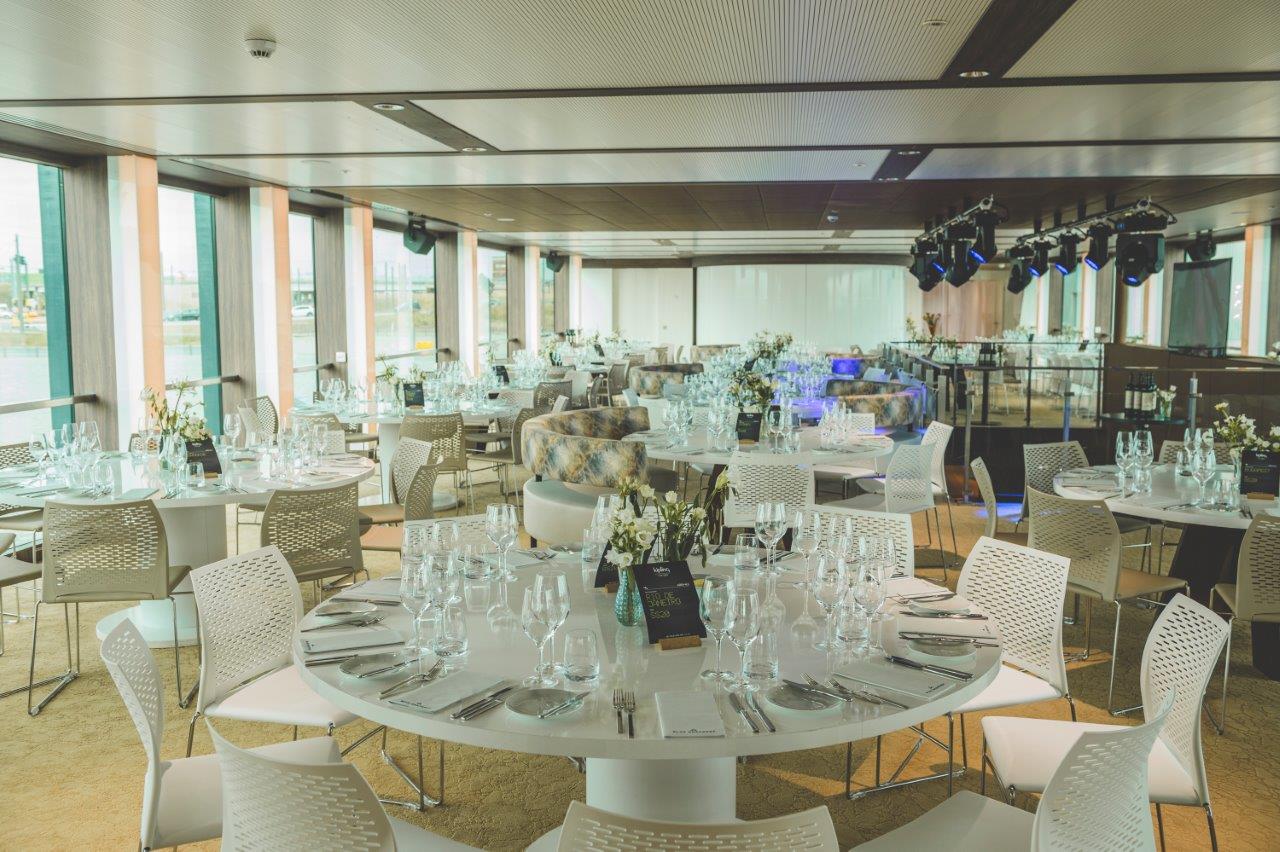 De Blue Rhapsody is in de eerste plaats een vaartuig met een futuristisch design, dat indruk maakt van buitenaf. Binnenin wordt het meteen duidelijk dat het schip, dat afgelopen zomer te water werd gelaten, specifiek is ontworpen voor het organiseren van verschillende soorten evenementen. Via de dekken ontdekken we verschillende ruimtes die geschikt zijn voor het ontvangen van kleine groepen in verschillende sferen, maar er zijn ook mogelijkheden voor grote groepen. Voor een zittend diner heeft het schip een totale capaciteit van 440 personen (2 dekken van ongeveer 220 personen), tegenover 250 mensen in theateropstelling. Als men alle ruimtes gebruikt, heeft de Blue Rhapsody een totale capaciteit van 600 personen (voor een walking dinner).