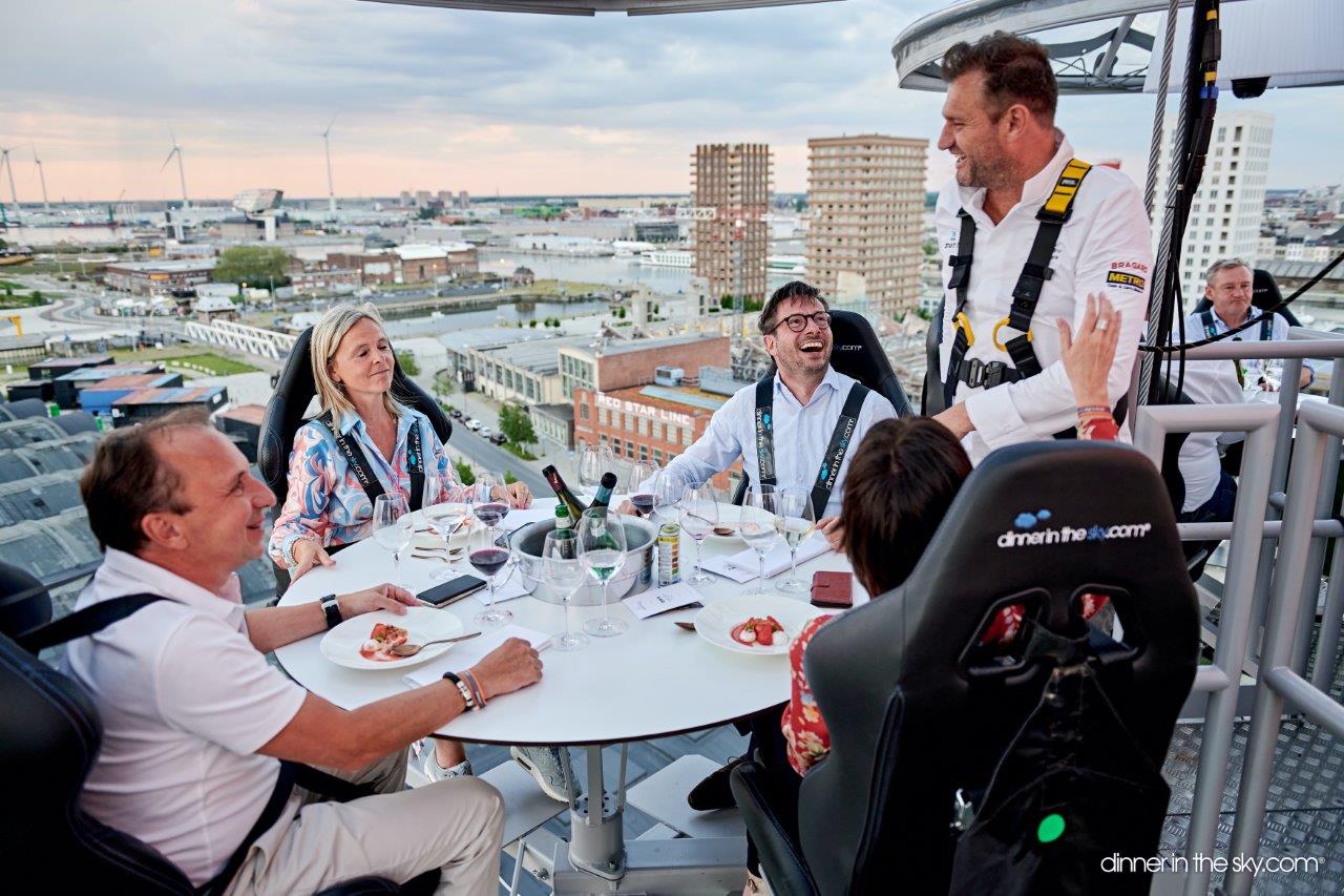 Bij Dinner in the Sky ben je onmiddellijk de perfecte gastheer die kan terugvallen op een Michelin sterrenchef aan het fornuis, verfijnde wijnen en een prachtig uitzicht op de city skyline. Ook dit jaar tekenen oa. Yves Mattagne, Wout Bru, Bart De Pooter… present als masterchefs die alles live bereiden in de open keuken.